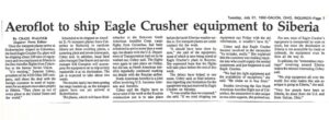 This made the local news as this was the first time that Russian aircraft had ever landed in the United States. Then I and one of Eagle Crushers salesmen, Don Bayer, had the pleasure (if you want to call it that) of riding for 20 plus hours in the cargo hold of the sixth plane full of equipment to Russia.